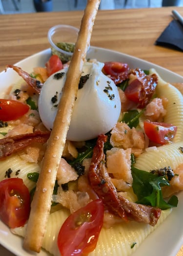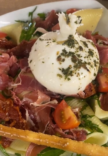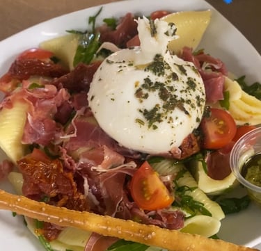 Salade fraîcheur à base de pâtes Conchiglie, Burrata, Jambon Cru, Huile de basilic, Tomates confites, Roquette, Gressin, Pesto au basilic frais.