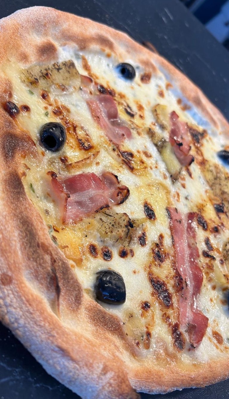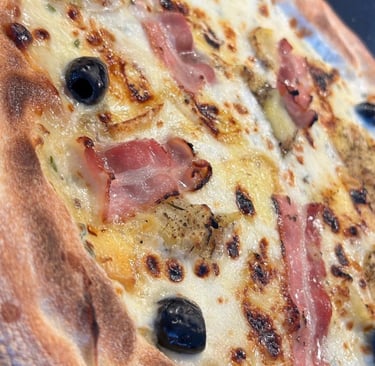 Pâte à pizza maison à fermentation lente 72 heures.Crème fraîche française, mozzarella, reblochonAOP, roquefort AOP, olives.mozzarella et olives.