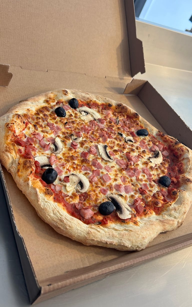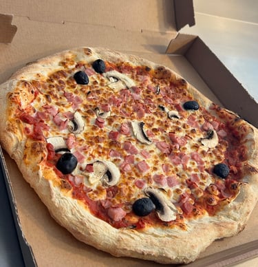 Pâte à pizza maison à fermentation lente 72 heures, sauce tomate, champignons frais, jambon au torchon Il, mozzarella et olives.